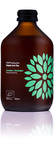 Összetevők: szűrt víz, bio fermentált tea (víz, bio glükóz, bio tea, bio almaecet, kombucha kultúrák), finomítatlan bio nádcukor, szén-dioxid, uborka kivonat (0,13%), koriander kivonat (0,04%).